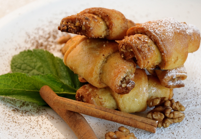 Цена за 100 гр. Творожно-песочные рогалики с начинкой из грецких орехов с сахаром.